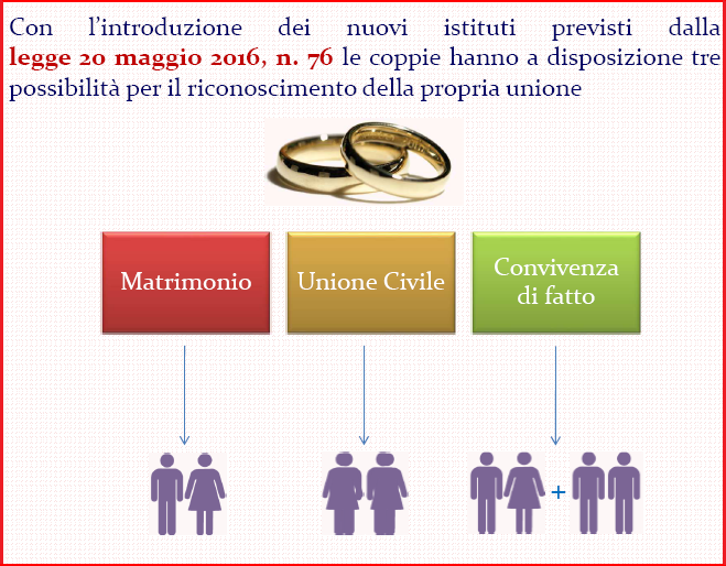 In data 5 giugno 2016 è entrata in vigore la legge 20 maggio 2016, n. 76 (G.U. 21/05/2016 S.G. n. 118) riguardante la “Regolamentazione delle unioni civili tra persone dello stesso sesso e disciplina delle convivenze” (scarica la legge 76-2016).