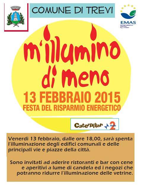 Qualunque iniziativa che miri a contenere il consumo di energia elettrica sarà ben accetta e potrà essere comunicata al Comune (al contatto mail ambiente@comune.trevi.pg.it) in modo da poterla diffondere pubblicamente. Sul sito Internet di Caterpillar http://caterpillar.blog.rai.it/milluminodimeno/ sarà possibile trovare ulteriori informazioni e aderire direttamente alla campagna di "M'illumino di meno".