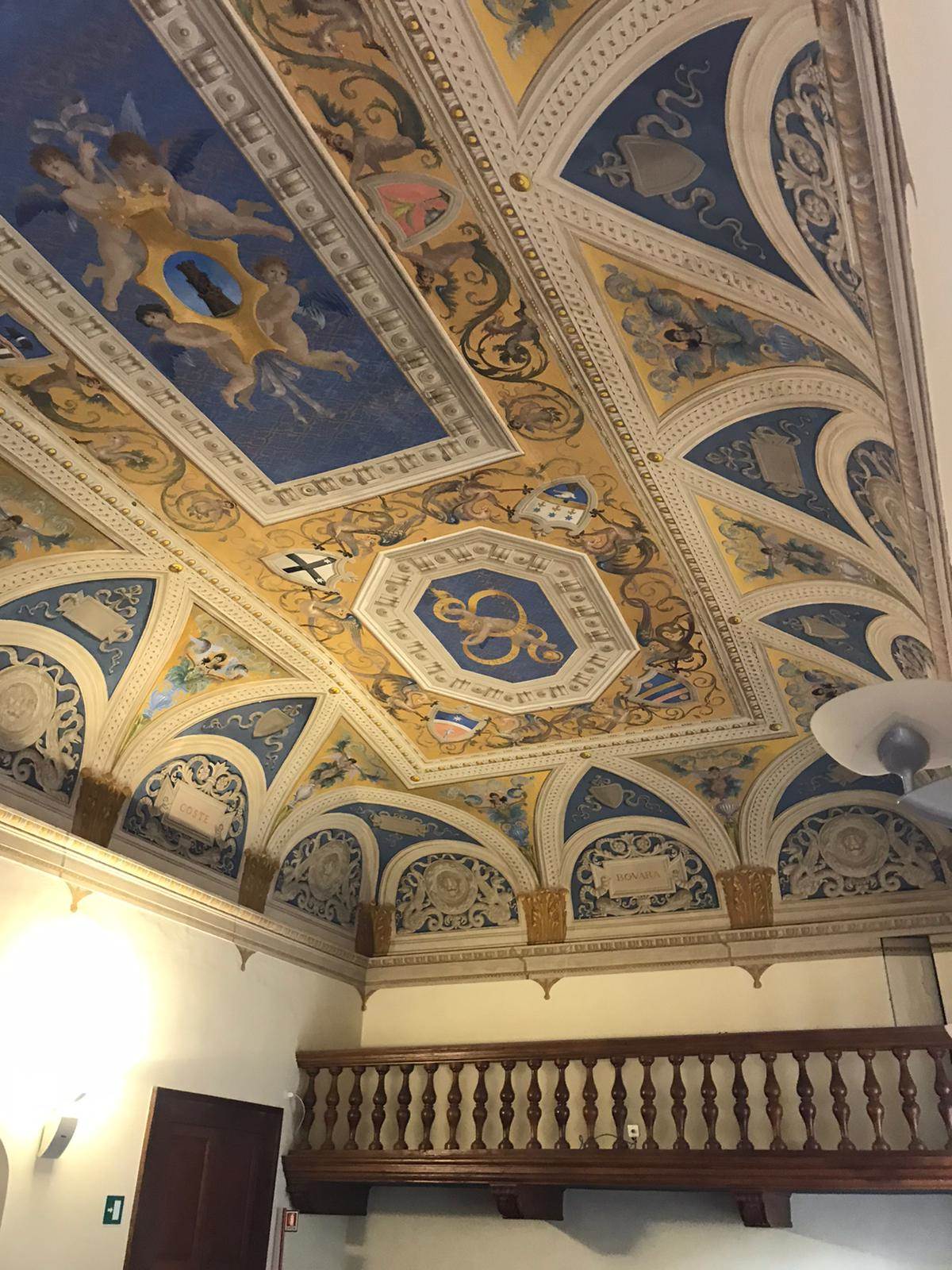 All’interno, di rilievo, sono le cantine al piano terra con belle volte a crociera in mattoni, ed un soffitto al primo piano, cassettonato e dipinto, ancorchè con pitture di modesto rilievo.